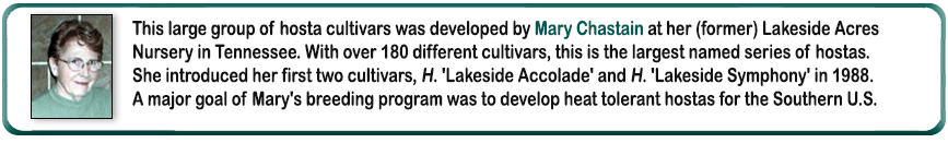 | 'Lakeside Chatterbox' | Small | Med-Green | | | Hybrid | Pure-White | July | Chastain, Mary | .1998 |