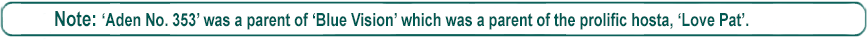 | 'Blue Vision' | Hybrid | 'Aden No. 355' | 'Aden No. 353' | Aden, Paul | (GENETIC BACKGROUND) 'Aden No. 353', 'Aden No. 355' ++(SIMILAR.HOSTAS) 'Blue Horizon' BLUEBOUNTY 'Sea Sapphire', 'Van Wade Blue' |
