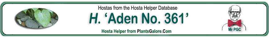 | 'Blue Angel' | Hybrid | 'Aden No. 365' | 'Aden No. 361' | Shaw, Florence | (GENETIC BACKGROUND) 'Aden No. 361', 'Aden No. 365', Hosta montana, 'Sieboldiana' ++(SIMILAR.HOSTAS) 'Bix Blues', 'Blue Mammoth', 'Bodacious Blue', 'Cool Change', 'Fond Hope', 'Headliner', 'Hercules', 'More Elegant', 'Prince of Wales', 'Snowden' |