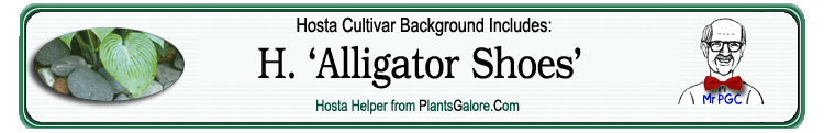 | 'Alligator Shoes' | Hybrid | 'Dorothy Benedict' | Hosta montana - | Benedict, Dr Ralph (Herb) & Hatfield, Handy & Walek, Kevin & The American Hosta Society | (GENETIC BACKGROUND) 'Dorothy Benedict', 'Elegans', 'Frances Williams', Hosta montana, 'Sieboldiana' |