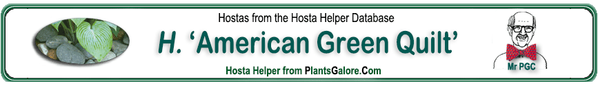 | 'American Green Quilt' | Unknown | - | - | Wade, Van | (TYPE) 'Sieboldiana' ++(SIMILAR.HOSTAS) 'Sea Monster' |