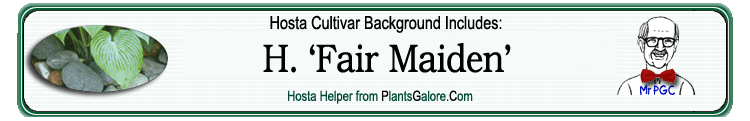 | 'Fairest Maiden' | Sport | 'Fair Maiden' | - | Schwarz, Jim | (GENETIC BACKGROUND) 'Amber Maiden', 'Candy Hearts', 'Fair Maiden', Hosta nakaiana ++(SIMILAR.NAME) 'Fairest Maiden' ++(SIMILAR.HOSTAS) 'Dixie Pixie' |