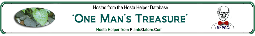| 'One Man's Treasure' | Sport | Hosta longipes hypoglauca | - | Benedict, Dr Ralph (Herb) & Solberg, Robert | (GENETIC BACKGROUND) Hosta longipes, Hosta longipes hypoglauca ++(SIMILAR.HOSTAS) 'Best of Twenty', 'Cinnamon Sticks', 'Grandaddy Red Legs', 'Green Sparkler', 'Judy Rocco', 'Red October', 'Swizzle Sticks' |