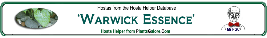 | 'Warwick Essence' | Hybrid | 'Northern Halo' (Walters) | Hosta plantaginea | Jones, Gil | (GENETIC BACKGROUND) 'Elegans', Hosta plantaginea, 'Northern Exposure', 'Northern Halo' (Walters), 'Sieboldiana' ++(SIMILAR.HOSTAS) 'Flower Power' |