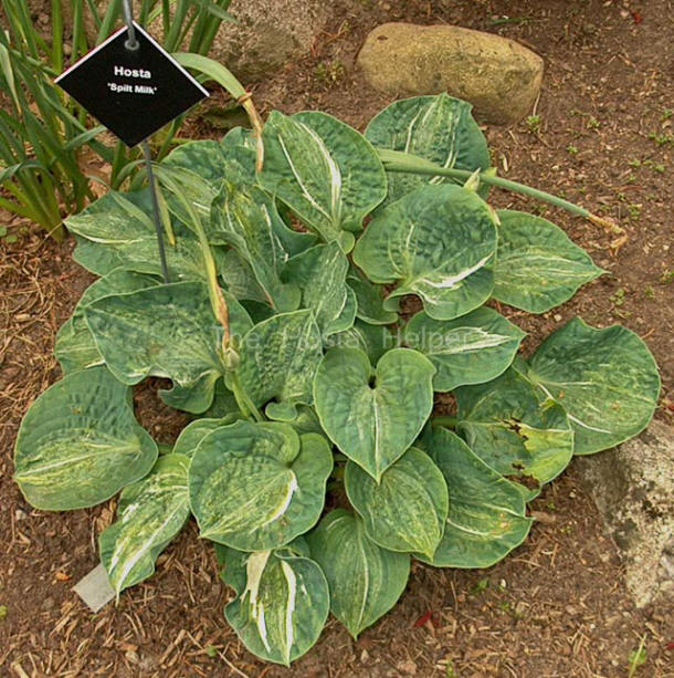 According to The Hostapedia by Mark Zilis (2009), this cultivar "...rates as one of Mildred Seaver's greatest introductions and has been very popular amongst collectors, gardeners and nurserymen alike...The variegation varies a bit from plant to plant, some exhibiting a bit more misting, others developing large white streaks."
