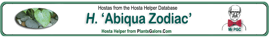 | 'Abiqua Zodiac' | Unknown | - | - | Purtymun, Charles & Walek, Kevin & The American Hosta Society | (SIMILAR.HOSTAS) 'Golden Fascination' ++(SIMILAR.NAME) 'Zodiac' |