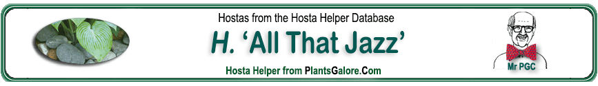 | 'All That Jazz' | Hybrid | 'Christmas Tree Gala' | 'Elatior' | Petryszyn, Olga | (GENETIC BACKGROUND) 'Beatrice', 'Christmas Tree', 'Christmas Tree Gala', 'Elatior', 'Elegans', 'Frances Williams', 'Sieboldiana', Hosta sieboldii ++(SIBLING.by.HYBRID) 'Mardi Gras' |