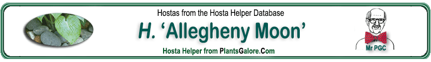 | 'Allegheny Moon' | Hybrid | 'Rich Uncle' | Unknown | Malloy, Alex | (GENETIC BACKGROUND) 'Abiqua Recluse', 'Aden No. 370', 'Aspen Gold', 'Bengee', 'Electrum Stater', 'Gold Cadet', 'Gold Cup', 'Golden Prayers', 'Golden Waffles', Hosta nigrescens, 'Rich Uncle', 'Sum and Substance', 'Sun Glow', 'Tokudama', 'Tokudama Aureonebulosa', 'White Vision' |