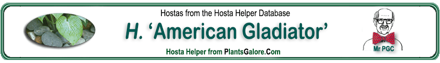 | 'American Gladiator' | Hybrid | 'William Lachman' | 'Love Pat' | Hansen, Hans | (GENETIC BACKGROUND) 'Aden No. 353', 'Aden No. 355', 'Blue Velvet', 'Tokudama', 'Blue Vision', 'Beatrice', Hosta sieboldii, 'Elegans', 'Frances Williams', 'Sieboldiana', 'William Lachman' |