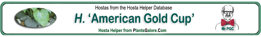 | 'American Gold Cup' | Unknown | - | - | Wade, Van | (GENETIC BACKGROUND) 'Tokudama' ++(SIMILAR.NAME) 'Rosedale Golden Cup', 'Brill's Gold Cup' ++(SIMILAR.HOSTAS) 'Golden Medallion', 'Golden Teacup' |
