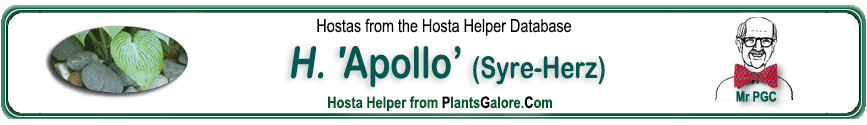 | 'Apollo' (Syre-Herz) | Hybrid | 'PeeDee Gold Flash' | 'Krossa Regal' | Syre-Herz, Ursula | (GENETIC BACKGROUND) 'Kabitan', Hosta nigrescens, 'PeeDee Gold Flash', Hosta rectifolia, Hosta sieboldii, 'Tokudama' ++(SAME.NAME) 'Apollo' (England), 'Apollo' (Malloy) |