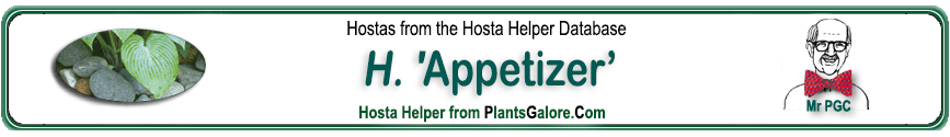 | 'Appetizer' | Hybrid | Complex Cross | Hosta venusta | Avent, Tony | (GENETIC BACKGROUND) 'Aden No. 270', 'Aden No. 275', 'Bright Lights', 'Fortunei', 'Fortunei Robusta', Hosta longissima, 'Neat Splash', Hosta sieboldii, 'Swoosh', 'Tokudama', 'Tokudama Aureonebulosa', Hosta venusta, 'Yellow Splash' |