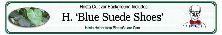 | 'Blue Suede Shoes' (Elslager) | Hybrid | 'Sea Prize' | 'Maekawa' | Elslager, Ed | (GENETIC BACKGROUND) Hosta hypoleuca, 'Maekawa', 'Sea Prize' ++(SIMILAR.HOSTAS) 'A B-1 Bomber', 'Blueberry Pancakes', 'Wild Blue Yonder' ++(SAME.NAME) 'Blue Suede Shoes' (Hostapedia) |