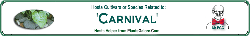 | 'Festival' (Malloy) | Sport | 'Carnival' | - | Malloy, Alex | (GENETIC BACKGROUND) 'Beatrice', 'Carnival', Hosta sieboldii ++(SAME.NAME) 'Festival' (Aden) |