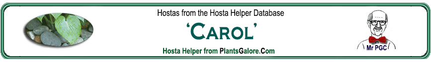 | 'Carol' | Sport | 'Fortunei' | - | Williams, Frances & The American Hosta Society | (GENETIC BACKGROUND) 'Fortunei' ++(DUPLICATE/INCORRECT.NAME) 'FRW No. 1429' ++(SIMILAR.HOSTAS) 'Francee', 'Green Gold' |