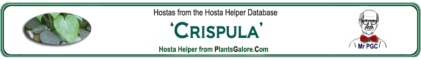 | 'Crispula Viridis' | Sport | 'Crispula' | - | Unknown | (GENETIC BACKGROUND) 'Crispula', Hosta montana ++(SIMILAR.HOSTAS) 'Daily Joy', 'Eunice Fisher', 'Great Desire', 'Maui Hana', 'Unique', 'Woodland Green' |