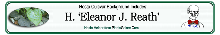| 'Eleanor J. Reath' | Hybrid | 'Frances Williams' | 'Elegans' | Reath, David | (GENETIC BACKGROUND) 'Elegans', 'Frances Williams', 'Sieboldiana', 'Tokudama' ++(SIMILAR.HOSTAS) 'Blue Mammoth', 'Elegans', 'Gray Cole', 'Helen Doriot', 'River Nile', 'Ryan's Big One', 'Silver Anniversary', 'Trail's End', 'Woodland Blue' |