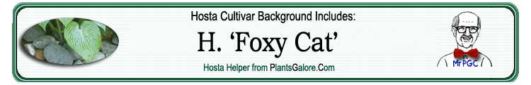 | 'Foxy Cat' | Hybrid | 'Foxy Doxy' | Unknown | Elslager, Ed | (GENETIC BACKGROUND) 'Beatrice', 'Elegans', 'Foxy Doxy', 'Frances Williams, 'Sieboldiana', Hosta sieboldii, 'William Lachman' |