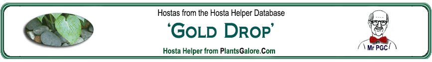 | 'Drip Drop' | Sport | 'Gold Drop' | - | Walters Gardens | (GENETIC BACKGROUND) 'August Moon', 'Fortunei', 'Gold Drop', 'Sieboldiana', Hosta venusta ++(SIMILAR.HOSTAS) 'Abby', 'Hawkeye', 'Hawkeye Gold', 'Parky's Prize', 'Radiant Edger', 'Sun Drop', 'Timothy' |