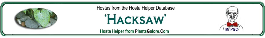 | 'Hacksaw' | Hybrid | 'Atom Smasher' | 'Stiletto' | Livingston, Ron | (GENETIC BACKGROUND) 'Aden No. 270', 'Aden No. 275', 'Amy Aden', 'Atom Smasher', 'Chartreuse Wiggles', 'Fascination', 'Flamboyant', 'Ginko Craig', 'High Fat Cream', 'Kifukurin Ubatake', Hosta pulchella, Hosta sieboldii, 'Stiletto', 'Wogon Gold' ++(SIMILAR.HOSTAS) 'Atomic Needle', 'Drunken Boy', 'Jaws', 'Lizard Lick', 'The Razor's Edge', 'Rickrack' |