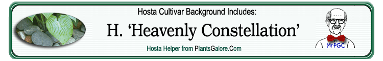 | 'Heavenly Constellation' | Hybrid | 'Breeder's Choice' | 'Maekawa' | Elslager, Ed | (GENETIC BACKGROUND) 'Beatrice', 'Breeder's Choice', 'Elegans', 'Frances Williams, Hosta hypoleuca, 'Maekawa', 'Sieboldiana', Hosta sieboldii |