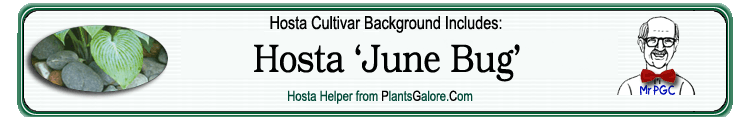 | 'June Bug' | Sport | 'Gold Edger' | - | Lydell, Ransom | (GENETIC BACKGROUND) 'Aden No. 359', 'Aden No. 381', 'Blue Cadet', 'Gold Cadet', 'Gold Edger', Hosta nakaiana (Possibly), 'Tokudama' ++(SIMILAR.HOSTAS) 'Sweet Home Chicago' |