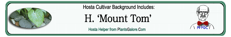 | 'Mount Tom' | Hybrid | 'Flamboyant' | 'Christmas Tree' | Lachman, Wm & Lachman, Eleanor | (GENETIC BACKGROUND) 'Beatrice', 'Christmas Tree', 'Elegans', 'Flamboyant', 'Frances Williams, 'Sieboldiana', Hosta sieboldi ++(SIMILAR.HOSTAS) 'Cavalcade' |