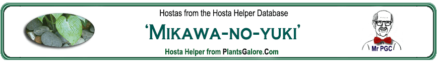 | 'Valley's Perfect Flow' | Hybrid | 'Mikawa-no-yuki' | Unknown | Linneman, Jeroen | (GENETIC BACKGROUND) Hosta kikutii, Hosta longipes, 'Mikawa-no-yuki' |