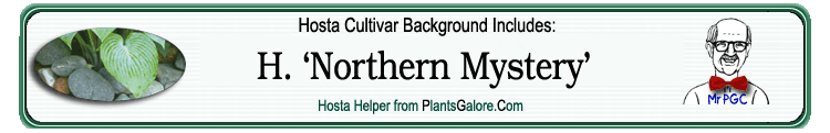 | 'Northern Mystery' | Sport | 'Northern Mist' | - | Falstad, C.H. & Walek, Kevin & The American Hosta Society | (GENETIC BACKGROUND) 'Elegans', 'Northern Mist', 'Sieboldiana' ++(SIMILAR.HOSTAS) 'American Masterpiece', 'Northern Mist' |