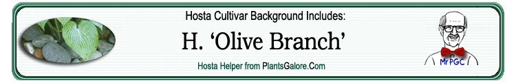 | 'Green Olive' | Sport | 'Olive Branch' | - | Schwarz, Jim | (GENETIC BACKGROUND) 'Candy Hearts', Hosta nakaiana, 'Olive Branch' ++(INFO.SOURCE: MyHosta Database) |
