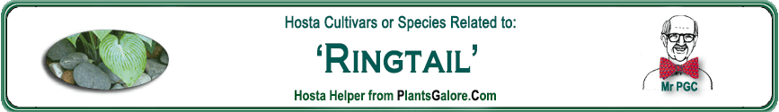 | 'Ringtail' | Hybrid | 'Green Fountain' | Unknown | Terpening, Kent | (GENETIC BACKGROUND) 'Green Fountain', 'Green Wedge' (Shaw), Hosta longipes, Hosta nigrescens ++(SIMILAR.HOSTAS) 'Jaws' |