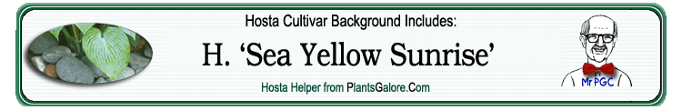 | 'Sea Yellow Sunrise' | Sport | 'Sea Sunrise' | - | Seaver, Mildred | (GENETIC BACKGROUND) 'Aden No. 270', 'Aden No. 275', 'Fortunei', 'Fortunei Robusta', 'Neat Splash', 'Sea Sunrise', Hosta sieboldii, 'Yellow Splash' ++(SIMILAR.HOSTAS) 'Winfield Gold' |