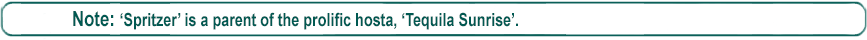 | 'Tequila Sunrise' | Hybrid | 'Spritzer' | Hosta pycnophylla | Johnson, Greg | (GENETIC BACKGROUND) 'Aden No. 349', 'Green Fountain', 'Green Wedge' (Shaw), Hosta longipes, Hosta nigrescens', Hosta pycnophylla, 'Spritzer' ++(SIMILAR.HOSTAS) 'Gilt by Association' |