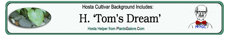 | 'Tom's Dream' | TC Sport | 'Joyce Trott' | - | Zilis, Mark | (GENETIC BACKGROUND) 'Bengee', 'Flamboyant', 'Joyce Trott', Hosta nigrescens, 'Sum and Substance', 'Tokudama', 'Tokudama Aureonebulosa' ++(SIMILAR.HOSTAS) 'Joyful' |