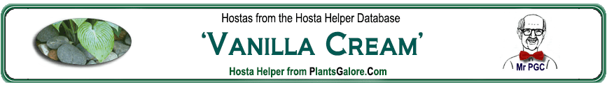 1 'Academy Flaxen Spades'Hybrid'Vanilla Cream'UnknownChamberlain, Steve(GENETIC BACKGROUND) 'Aden No. 456', 'Golden Waffles', 'Little Aurora', 'Tokudama', 'Tokudama Aureonebulosa', 'Vanilla Cream' ++(SIMILAR.HOSTAS) 'Vanilla Cream'