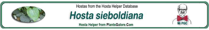 | 'Abiqua Elephant Ears' | Hybrid | 'Sieboldiana' | Unknown | Walden West Nursery | (GENETIC BACKGROUND) 'Sieboldiana' ++(SIMILAR.HOSTAS) 'Bethel Big Leaf', 'King Michael' |