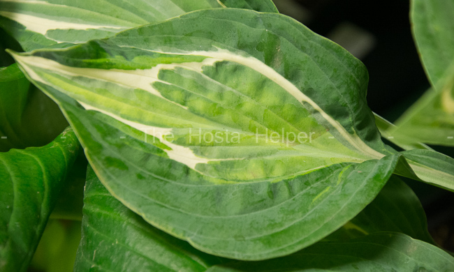 A fast growing sport of H. 'Pin-up', this cultivar was registered by Danny Van Eechaute from Belgium in 2012. It grows to a medium size about 13 inches high with a spread of around 30 inches. The blue-green foliage has a greenish yellow medial (center) variegation. It is moderately flat, ovate and has a glaucous bloom on top.  Pale lavender flowers bloom from June into July.
