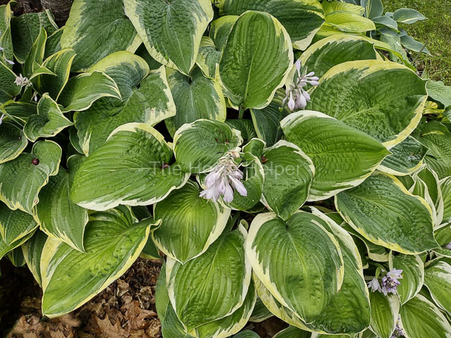 This non-registered cultivar is a sport of H. 'Blue Umbrellas'. It has green foliage with yellow marginal variegation.