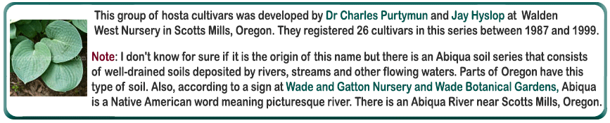 | 'Abiqua Blue Edger' | Small | Blue/Green | | | Unknown | Pale-Lavender | July | Walden West Nursery | .1987 |