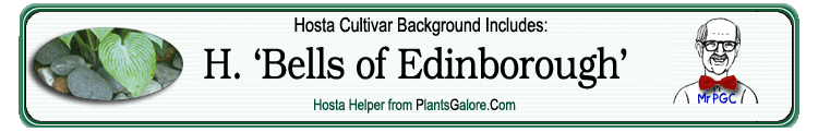 | 'Bells of Edinborough' | Hybrid | 'Rim Rock' | Unknown | Savory, Robert | (GENETIC BACKGROUND) Hosta nakaiana, 'Rim Rock', Hosta venusta (GENETIC BACKGROUND) ++(SIMILAR.HOSTAS) 'Vilmoriniana' |