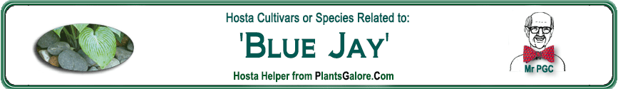 | 'Blue Jay' | Hybrid | 'Dorset Blue' | 'Dorset Blue' | Benedict, Dr Ralph (Herb) | (GENETIC BACKGROUND) 'Dorset Blue', 'Elegans', Hosta longipes, Hosta longipes lancea, 'Sieboldiana', 'Tardiflora' ++(TYPE) Tardiana ++(SIMILAR.NAME) 'Abiqua Blue Jay' ++(SIMILAR.HOSTAS) 'Blue Hearts', 'Brother Ronald' |