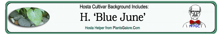 | 'Blue June' | Hybrid | 'Blue Diamond' | Tardiana Type | Smith, Eric & Benedict, Dr Ralph (Herb) | (GENETIC BACKGROUND) 'Blue Diamond', 'Elegans', Hosta longipes, Hosta longipes lancea, 'Sieboldiana', 'Tardiflora' ++(TYPE) Tardiana |