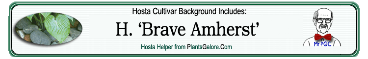 | 'Brave Amherst' | Hybrid | 'Christmas Tree' | 'Reversed' | Lachman, Wm & Lachman, Eleanor | (GENETIC BACKGROUND) 'Beatrice', 'Christmas Tree', 'Elegans', 'Frances Williams', 'Reversed', 'Sieboldiana', Hosta sieboldii ++(SIMILAR.HOSTAS) 'Aurora Borealis', 'Frances Williams', 'Fringe Benefits' |