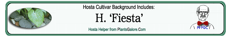 | 'Fiesta' | Hybrid | 'Pin Stripe Sister' | 'Maekawa' | Elslager, Ed | (GENETIC BACKGROUND) 'Beatrice', 'Breeder's Choice', 'Elegans', 'Frances Williams', Hosta hypoleuca, 'Sieboldiana', Hosta sieboldii |