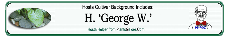 | 'George W.' | Hybrid | 'Dorothy Benedict' | 'Incredible Hulk' | Elslager, Ed | (GENETIC BACKGROUND) 'Dorothy Benedict', 'Elegans', 'Frances Williams', 'Incredible Hulk', 'Sieboldiana' ++(SIMILAR.HOSTAS) 'Eggs Benedict' |