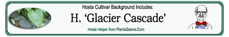 | 'Orinoco Flow' | Hybrid | 'Glacier Cascade' | Unknown | Cross, Peter | (GENETIC BACKGROUND) 'Glacier Cascade', Hosta hypoleuca, Hosta kikutii ++(TYPE) Hosta montana |