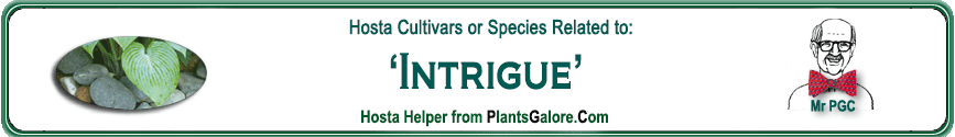 | 'Splish Splash' | Hybrid | 'Fascination' | 'Intrigue' | Aden, Paul | (GENETIC BACKGROUND) 'Aden No. 270', 'Aden No. 275', 'Fascination', 'Flamboyant', 'High Fat Cream' ++(SIMILAR.HOSTAS) 'Fascination', 'Neat Splash' |