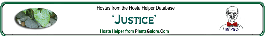 | 'Justice' | TC Sport | 'Elatior' | - | Zilis, Mark | (GENETIC BACKGROUND) 'Elatior' ++(SIMILAR.HOSTAS) 'Niagara on the Lake', 'Victory' |