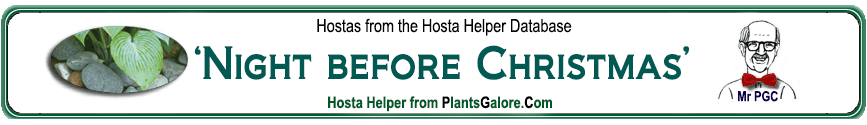 | 'Night before Christmas' | Sport | 'White Christmas' | - | Machen, John | (GENETIC BACKGROUND) 'Krossa Regal', Hosta nigrescens, Hosta rectifolia, 'Tokudama', 'White Christmas' ++(SIMILAR.HOSTAS) 'Cascades', 'Undulata Univittata' |