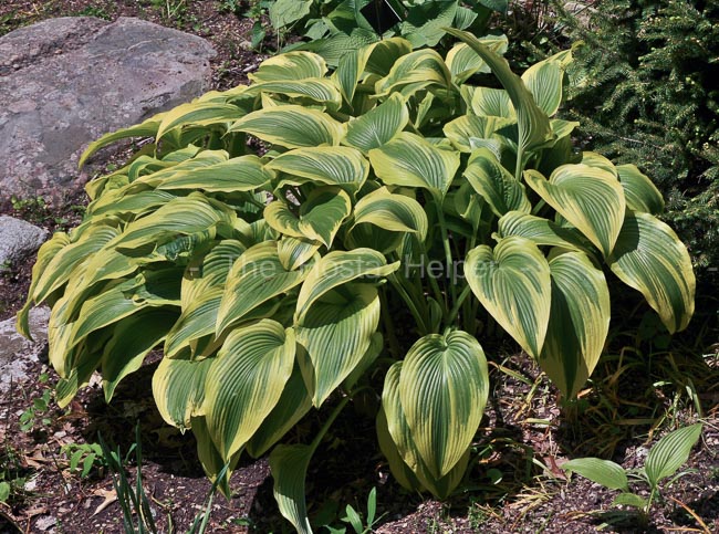 This large size (27 inches high by 68 inches wide) plant is known for its upright, vase-shape. The leaves have deeply impressed veins, are slightly wavy and faintly corrugated. The bright yellow on the leaf fades to chartreuse as the season progresses. Very pale lavender flowers bloom in late July. The flowers are subtended by whitish bracts.